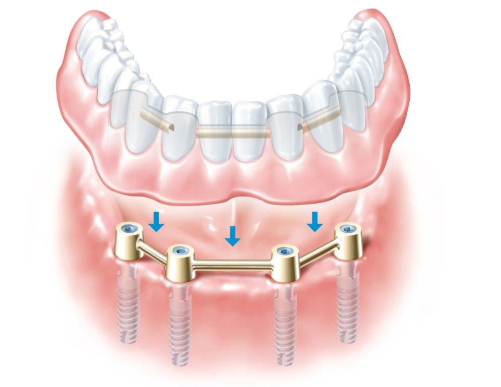Die ästhetisch anspruchvollste Lösung für zahnlose Kiefer ist die fest verschraubte Zahnreihe. Sie wird direkt auf den Implantaten fixiert und schliesst in der Regel harmonisch mit dem Zahnfleisch ab.